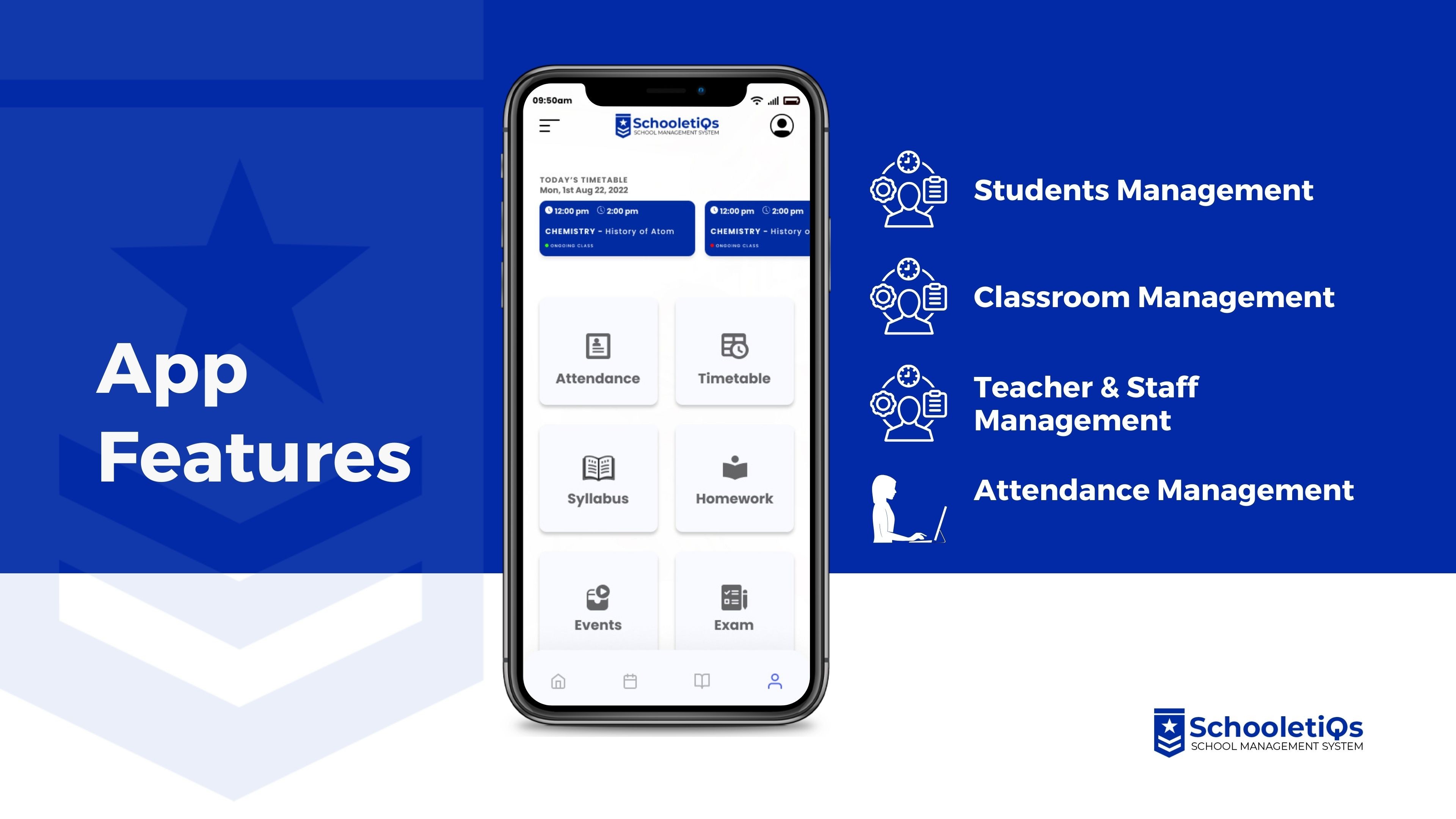 In accordance with the web view, SchooletiQs mobile app keeps track of the student's attendance, homework, events, and fees and helps school managements obtain access to school documents, attachments, and events.
