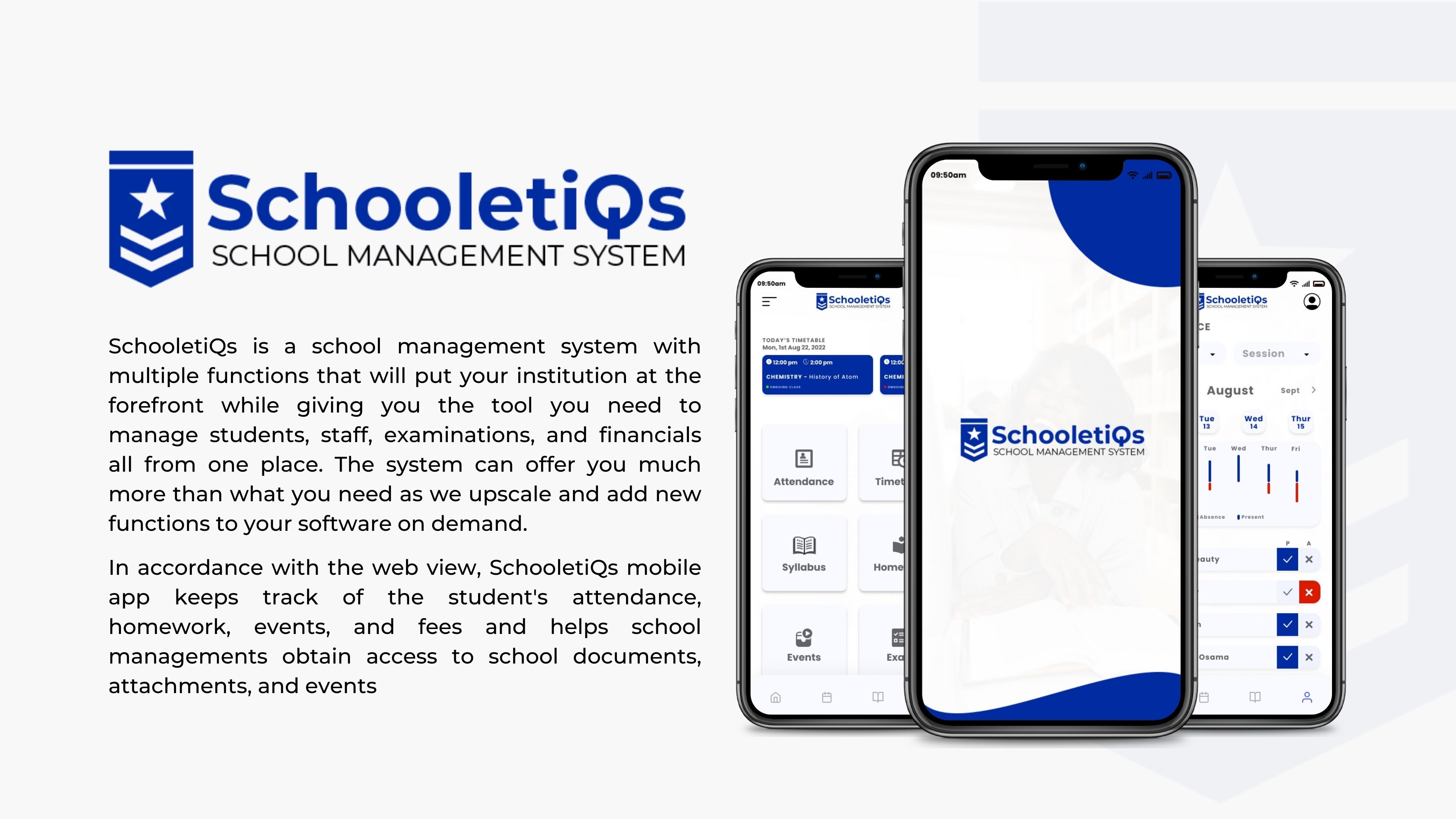 SchooletiQs is a school management system with multiple functions that will put your institution at the forefront while giving you the tool you need to manage students, staff, examinations, and financials all from one place. The system can offer you much more than what you need as we upscale and add new functions to your software on demand.